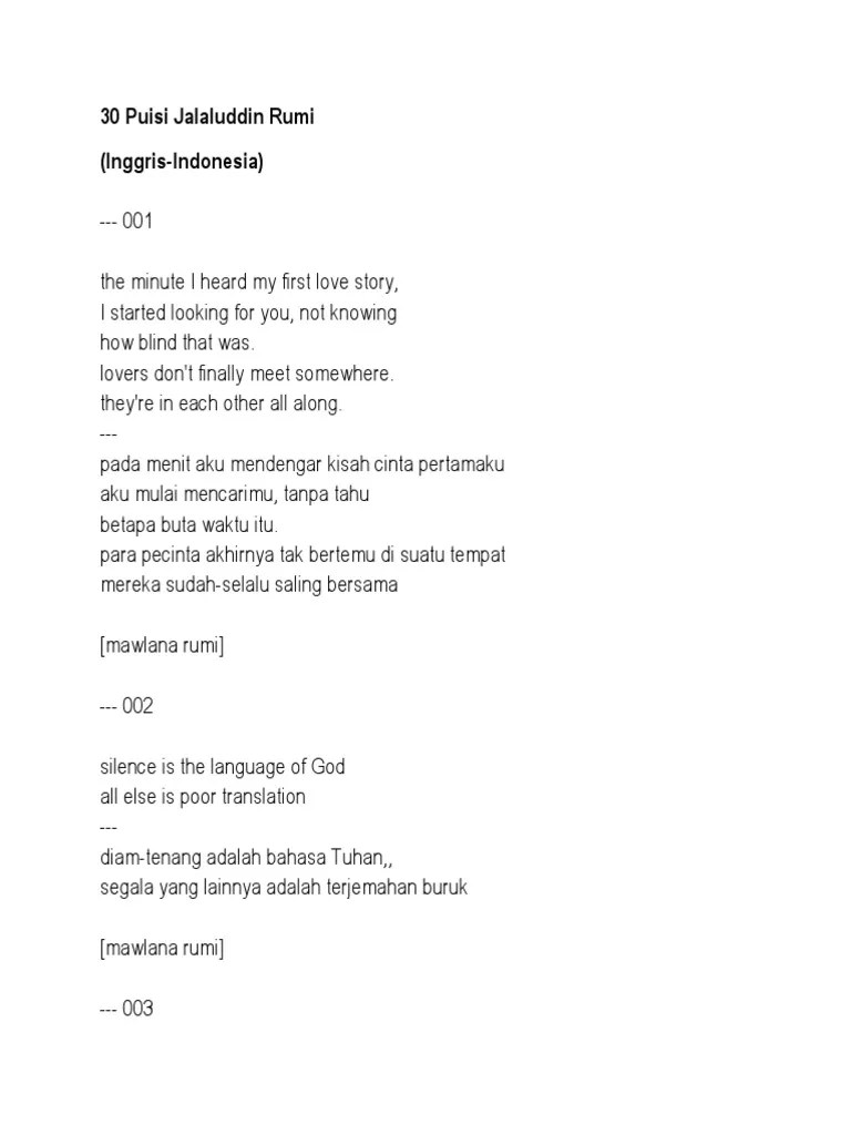 Sekitar sembilan judul syair dan sajak jalaluddin rumi puisi cinta dan lain kisah cerita puisi karya jalaluddin rumi. Sekitar 16 judul puisi karya jalaludin rumi yang berisi puisi nasehat dan puisi agama islam dan lainnya. Kesufian dan kepenyairan jalaluddin rumi dimulai ketika ia sudah . Berikut adalah aneka puisi syair pilihan karya jalaluddin rumi. Gambar puisi cinta karya jalaludin rumi.